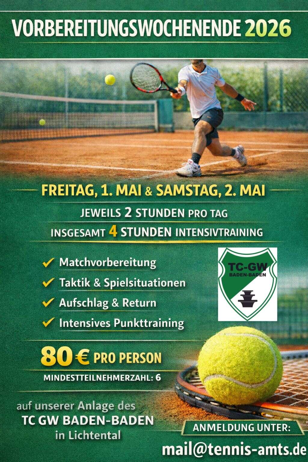 Trainingsinhalte: Matchvorbereitung, Taktik und Spielsituationen, Aufschlag & Return, Intensives Punktetraining