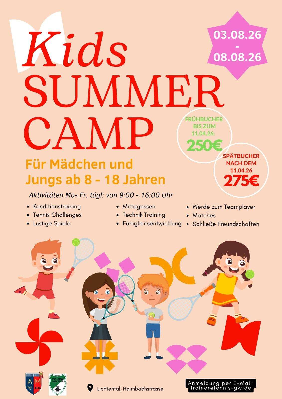 Du bist zwischen 8 und 18 Jahre alt und hast Lust auf Tennis, Action und neue Freunde? Dann ist unser Kids Summer-Camp genau dein Ding!