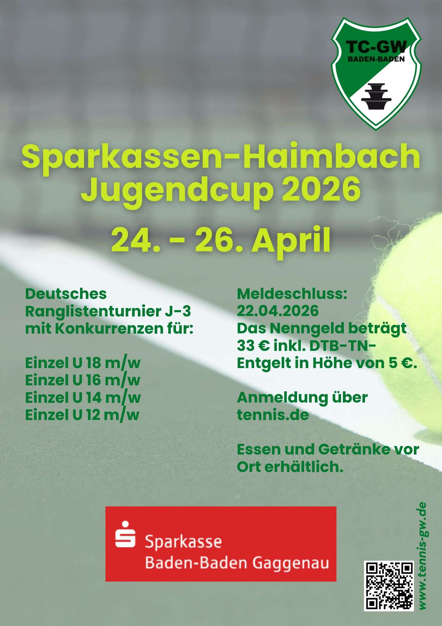 Auch 2026 gibt es eine neue Auflage des Sparkassen-Haimbach-Jugendcup in der Kategorie J-3 (DTB-Ranglistenturniere). Gespielt wird in den Klassen W12 / M12, W14 / M14, W16 / M16 und W18 / M18. Der Verband hat die Zulassung erteilt und hier geht es direkt zur Anmeldung und den weiteren Informationen. Meldeschluss ist am 22.04.2026 um 18:00 Uhr, die Auslosung findet im Anschluss daran statt.