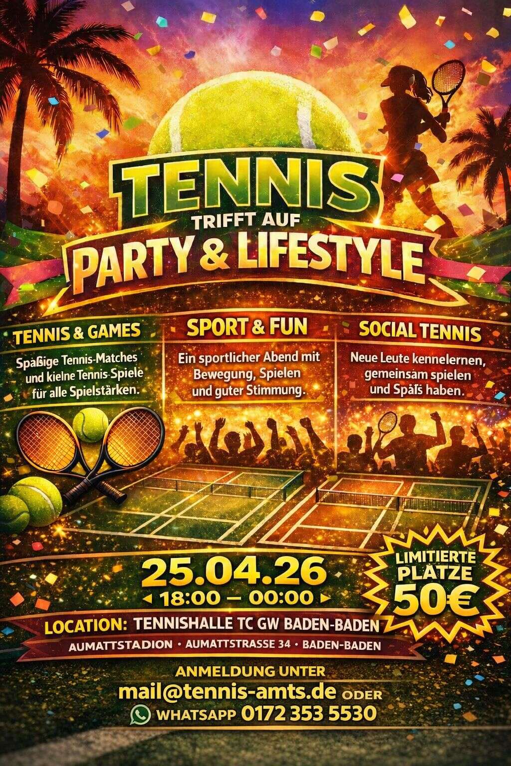 Noch eine Veranstaltung der ANDREI MIHAI TENNISSCHULE in unserer Halle. Zum ersten Mal wird das Tennis Spring-break Festival für Spielerinnen und Spieler ab U18 angeboten. Ab jetzt kann man sich per Mail an mail@tennis-amts.de oder per WhatsApp unter +49 172 3535530 anmelden.